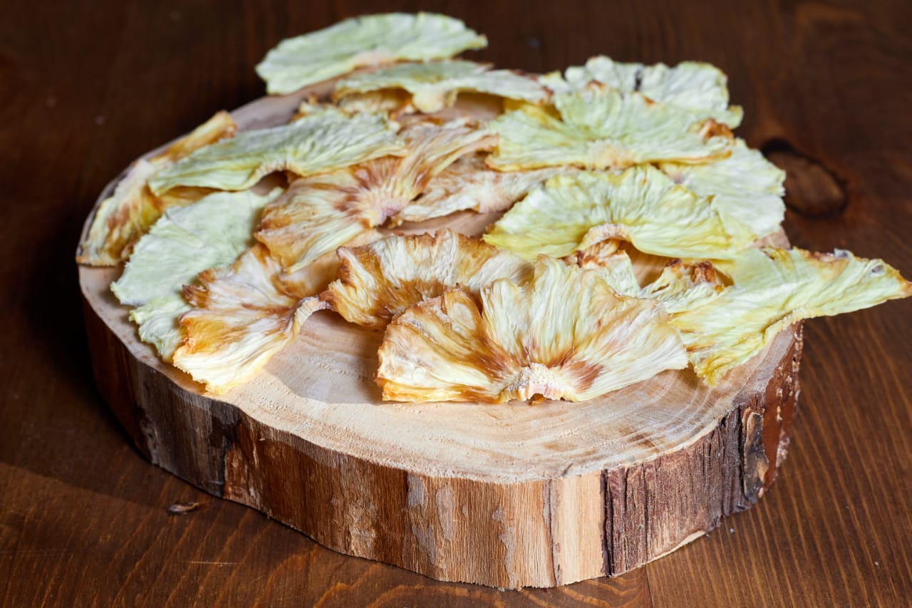 Ананасовые чипсы-это вкуснейший сушеный фрукт без сахара.Содержит в себе цинк,калий,железо которые очень полезны для здоровья человека.Сушеный ананас способен снимать отеки,придает сил,энергии, поднимает настроение.